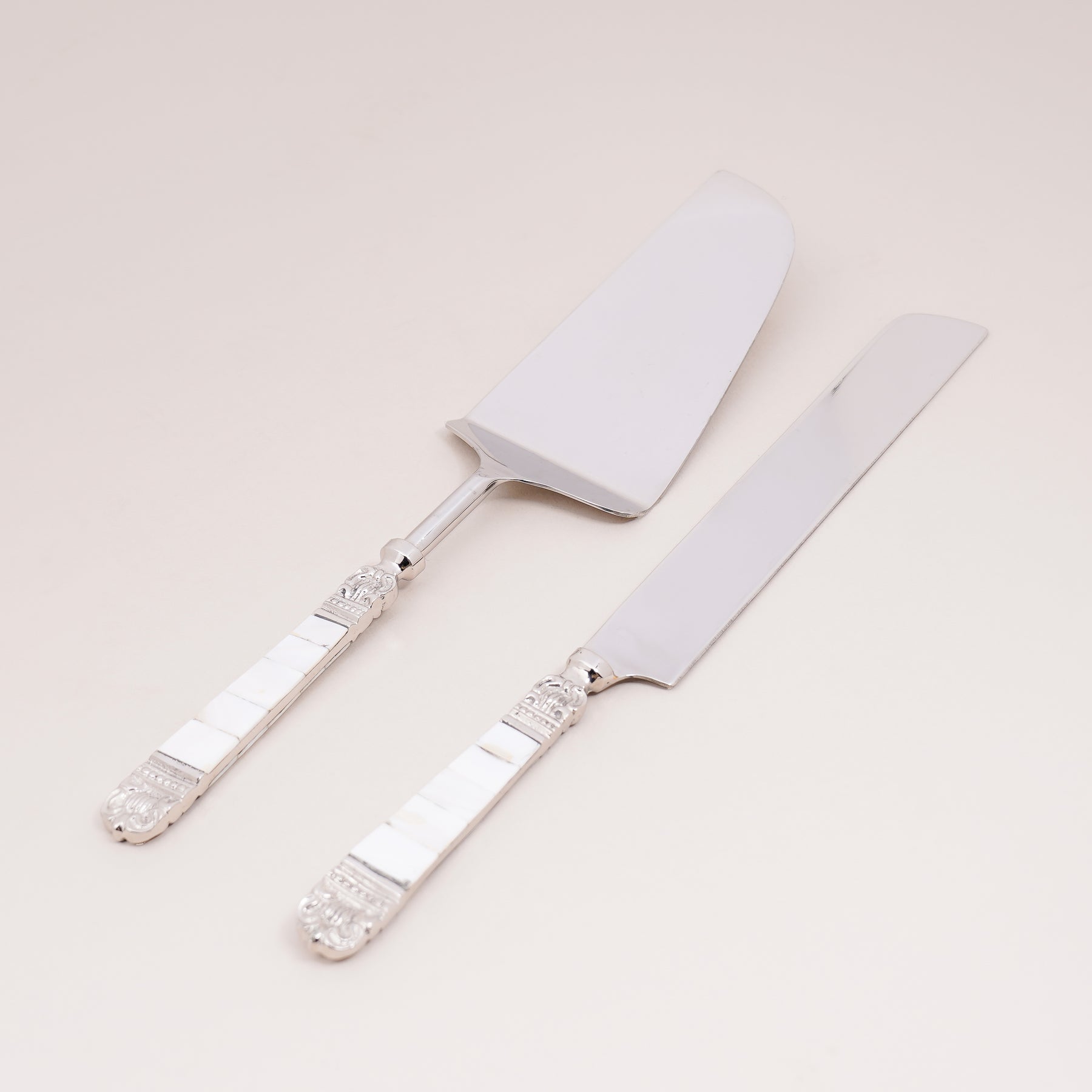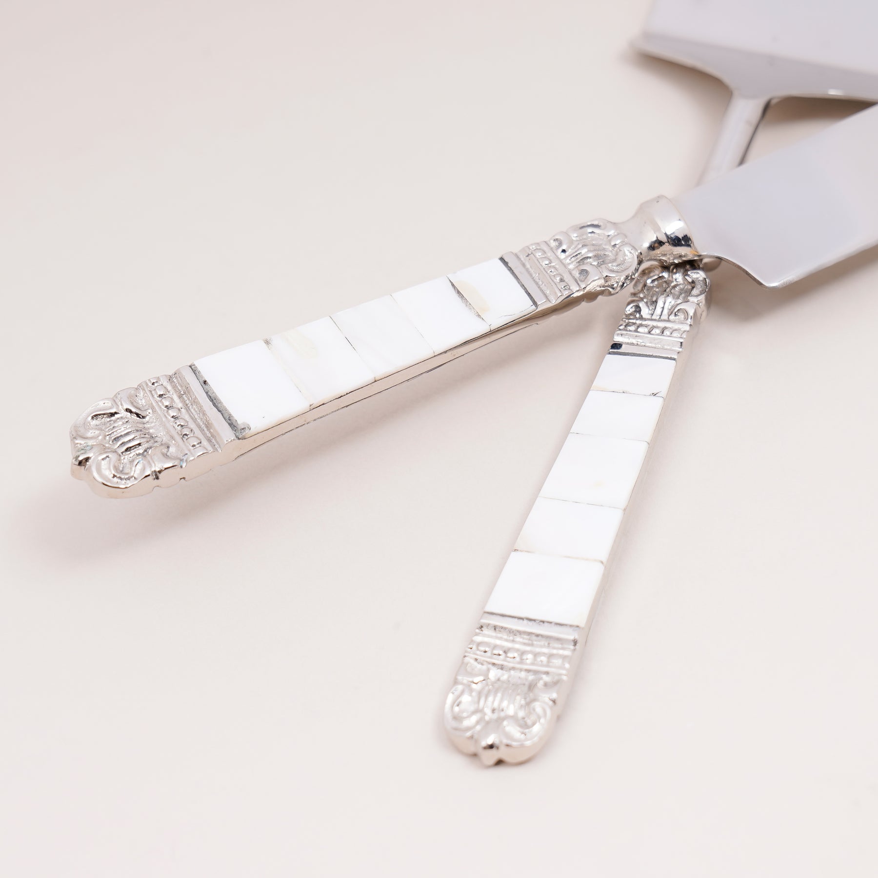 Featuring elegant white tile handles, this 2-piece cake cutter and server set is perfect for weddings, parties, and special occasions.