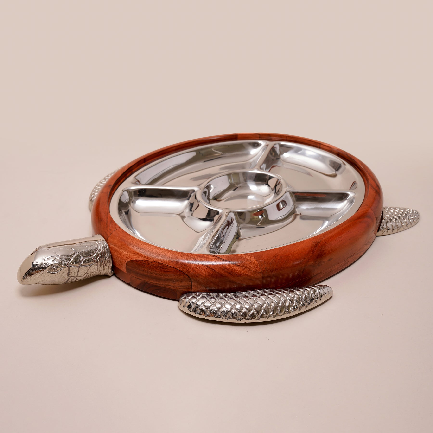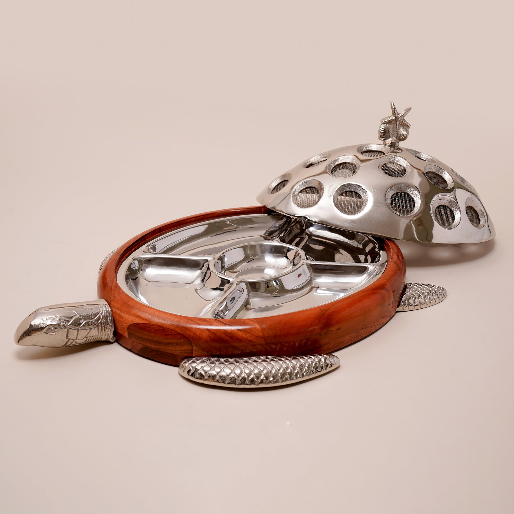 A whimsical tribute to the ocean, the Turtle Shell Serving Bowl features a polished wooden base cradled by a gleaming silver turtle lid, designed with cutout shell motifs. Functional yet artistic, this piece makes for a delightful centrepiece or snack server, adding a splash of coastal elegance to your table.