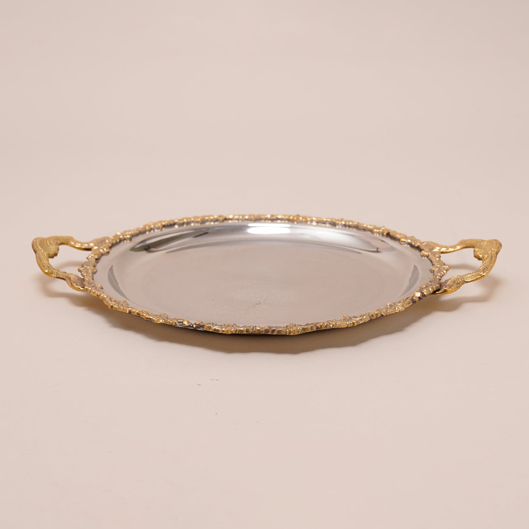 Crafted in polished steel with intricate brass handles, the Aureus Round Tray offers elegance in every detail. Perfect for weddings, celebrations, or formal entertaining.